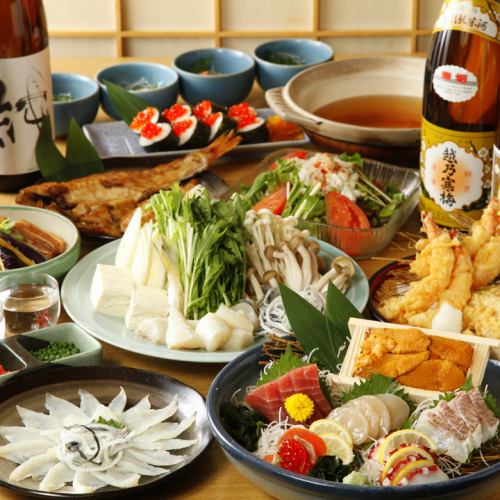 リーズナブルながら、新鮮な刺身盛りなど人気メニューを楽しめる飲み放題付きコースを5,000円(税込)~ご用意しております。さらに+500円(税込)で〆の料理を名物「へぎそば」に変更可能なプランもご用意。ご友人との飲み会はもちろん、会社宴会や接待、女子会など、さまざまなシーンに合わせてご利用いただけます。